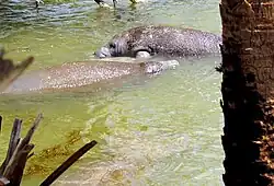 The gestation period in manatees lasts for 12–14 months, after which they give birth to one calf at a time or, rarely, twins.[60] When twins are born, they are fraternal twins and are dizygotic.[64] When a calf is born, it usually weighs 60–70 lb (27–32 kg) and is 4.0–4.5 ft (1.2–1.4 m) long. Manatees do not form permanent pair bonds, and the male contributes no parental care to the calf, which remains with the mother for up to two years prior to weaning. Female manatees have two axillary mammary glands located under their flippers. The lactation period for mothers and their calves last typically for one to two years. Prior to weaning, there is an increase in the hormone progesterone in the mother.[65] During this two-year period with their mother, calves learn how to locate warm water sources for winter and about migration routes for the summer seasons.[66] A single female can reproduce once every 2–3 years, which is referred to as the calving interval.[11] Wild manatees have been documented producing offspring into their late 30s, and a female captive manatee has given birth in her 40s.[4]