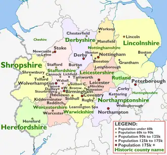 The official region contains the ceremonial counties of Herefordshire, Shropshire, Staffordshire, Warwickshire, West Midlands and Worcestershire.