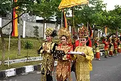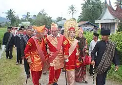 The Minang community is part of the Deutro-Malay community who migrated from Southern China to the island of Sumatra around 2,500–2,000 years ago. It is estimated that this community group entered from the east of the island of Sumatra, along the Kampar River to the highlands called darek which became the home of the Minangkabau people.[21] Some of these darek areas then form a kind of confederation known as luhak, which is then referred to as Luhak Nan Tigo, which consists of Luhak Tanah Data, Luhak Agam, and Luhak Limopuluah Koto. During the era of the Dutch East Indies, the luhak area became a territorial government area called afdeling, headed by a resident who by the Minangkabau community was called the name Tuan Luhak.[19] Initially, The Minangkabau people were included as a sub-group of the Malays, but since the 19th century, the Minangkabau and the Malays began to be seen as distinguished, from the matrilineal culture of the Minangkabau that persisted compared to the patrilineal culture adopted by Malay society in general.[22]