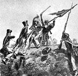In the early 19th century a conflict broke out between the Padri and the Adat. In several negotiations there was no agreement between them. Pagaruyung's kingdom was in turmoil, and the peak of the war was when the Padri under the leadership of Tuanku Pasaman attacked Pagaruyung in 1815. Sultan Arifin Muningsyah was forced to abdicate and escape from the royal capital to Lubuk Jambi.[43][44] Under pressure by the Padri, the Pagaruyung royal family requested assistance from the Dutch, and before that they had conducted diplomacy with the British when Raffles visited Pagaruyung and promised them assistance.[35] On February 10, 1821, Sultan Tangkal Alam Bagagarsyah, the nephew of Sultan Arifin Muningsyah, in Padang along with 19 other traditional leaders signed an agreement with the Dutch to cooperate in fighting the Padri, even though he was considered not entitled to make an agreement on behalf of the kingdom of Pagaruyung.[45][33] As a result of this agreement, the Netherlands considered it a sign of surrender of the kingdom of Pagaruyung to the Dutch government.[30] After the Dutch captured Pagaruyung from the Padri, in 1824 at the request of Lieutenant Colonel Raaff, Sultan Arifin Muningsyah returned to Pagaruyung, but in 1825, Sultan Arifin Muningsyah, the last king in Minangkabau, died and was later buried in Pagaruyung.[33] Sultan Tangkal Alam Bagagarsyah on the other hand wanted to be recognized as the king of Pagaruyung, but the Dutch East Indies government had limited his authority and only appointed him the Regent of Tanah Datar.[33] Because of the policy it encouraged Sultan Tangkal Alam Bagagarsyah to start thinking about expelling the Dutch from the region.[35]