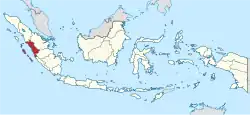 West Sumatra (Indonesian: Sumatera Barat[9]) is a province of Indonesia. It is on the west coast of the island of Sumatra and includes the Mentawai Islands off that coast. West Sumatra borders the Indian Ocean to the west, as well as the provinces of North Sumatra to the north, Riau to the northeast, Jambi to the southeast, and Bengkulu to the south. The province has an area of 42,119.54 km2 (16,262.45 sq mi), or about the same size as Switzerland or Penza Oblast, with a population of 5,534,472 at the 2020 census.[10] The official estimate at mid 2024 was 5,836,160 (comprising 2,940,270 males and 2,895,880 females).[1] The province is subdivided into twelve regencies and seven cities. It has relatively more cities than other provinces outside Java,[11] although several of them are relatively low in population compared with cities elsewhere in Indonesia. Padang is the province's capital and largest city.
