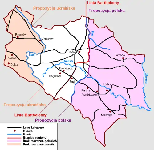 In this situation, General Barthelemy presented his compromise proposal on 28 January 1919. The armistice line was to run along the Bug River to Kamionka Strumiłłowa, then along the border of the districts to Bóbrka, then along the Bóbrka-Wybranka railway line, westwards to Mikołajów (leaving Mikołajów itself on the Ukrainian side), then along the railway line Lviv-Stryi to the border of the disputed territory in the Eastern Carpathians. The Stryi-Lavochne railway line was to remain in Ukrainian hands.[31] This was to be a temporary line, until the matter was settled by the Paris Peace Conference.[32]