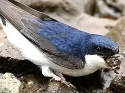 The western house martin (Delichon urbicum), sometimes called the common house martin, northern house martin or, particularly in Europe, just house martin, is a migratory passerine bird of the swallow family which breeds in Europe, north Africa and across the Palearctic; and winters in sub-Saharan Africa and tropical Asia. It feeds on insects which are caught in flight, and it migrates to climates where flying insects are plentiful. It has a blue head and upperparts, white rump and pure white underparts, and is found in both open country and near human habitation. It is similar in appearance to the two other martin species of the genus Delichon, which are both endemic to eastern and southern Asia. It has two accepted subspecies.