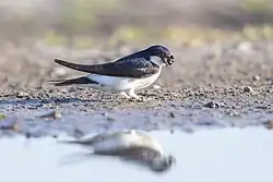 The western house martin is similar in habits to other aerial insectivores, including other swallows and martins and the unrelated swifts, and catches insects in flight.[9] In the breeding areas, flies and aphids make up much of the diet, and in Europe, the house martin takes a larger proportion of aphids and small flies than the barn swallow.[9] As with that species, hymenopterans, especially flying ants, are important food items in the wintering area.[9]