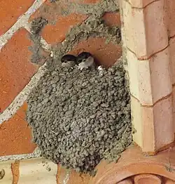 The western house martin was originally a cliff and cave nester, and some cliff-nesting colonies still exist, with the nests built below an overhanging rock. It now largely uses human structures such as bridges and houses. Unlike the barn swallow, it uses the outside of inhabited buildings, rather than the inside of barns or stables. The nests are built at the junction of a vertical surface and an overhang, such as on house eaves, so that they may be strengthened by attachment to both planes.[9]