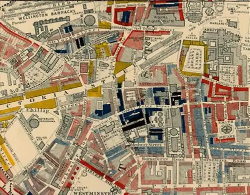 Part of Charles Booth's poverty map showing Westminster in 1889. The colours of the streets represent the economic class of the residents: Yellow ("Upper-middle and Upper classes, Wealthy"), red ("Lower middle class – Well-to-do middle class"), pink ("Fairly comfortable good ordinary earnings"), blue ("Intermittent or casual earnings"), and black ("lowest class occasional labourers, street sellers, loafers, criminals and semi-criminals"). Booth coloured Victoria Street, with its new shops and flats, yellow. The model dwellings built by the Peabody Trust on the side streets off Victoria Street appear as pink and grey, signalling modest respectability, while the black and blue streets represent the remaining slum areas housing the poorest.[15]