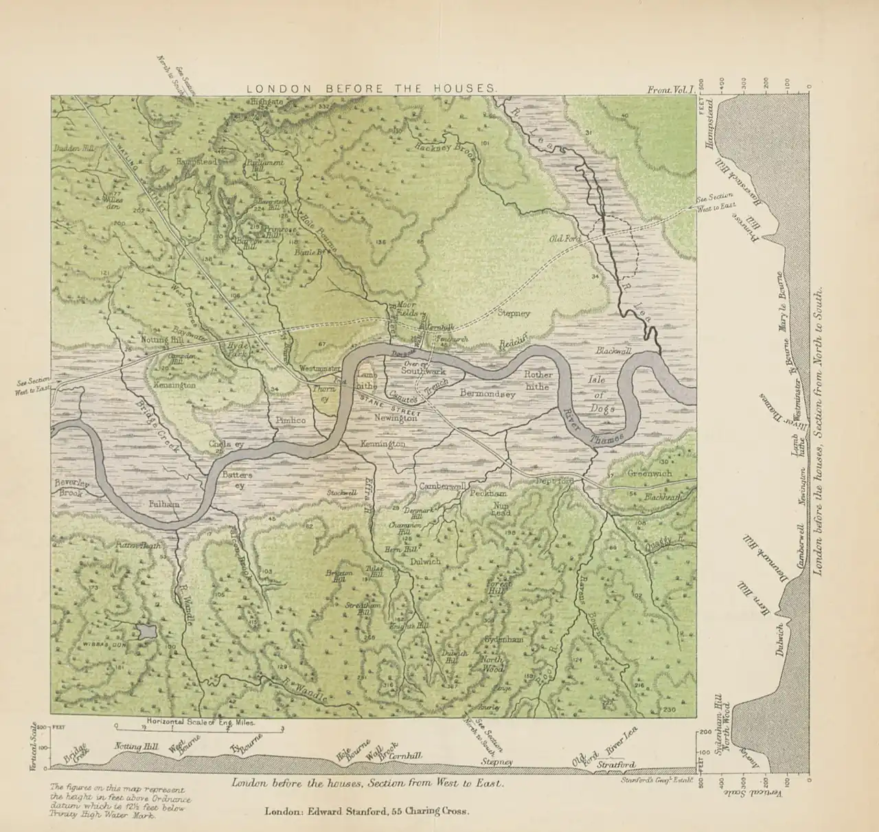 Westminster before urbanisation. The Roman road (modern Oxford Street) is shown at top running west.