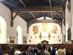 College Hall, the 14th-century abbot's state dining hall, is one of the oldest and finest examples of a medieval refectory and still in daily use for that purpose in term-time; outside of term it reverts to the dean as the abbot's successor.[86] Queen Elizabeth Woodville took sanctuary here in 1483 with five daughters and her son Richard of Shrewsbury, Duke of York, but failed to save him from his fate as one of the Princes in the Tower. In the 1560s, Elizabeth I several times came to see her scholars act their Latin plays on a stage in front of the attractive Elizabethan gallery, which may have been first erected especially for the purpose.[87][88]