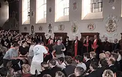 The Greaze has been held "up School" (in the School Hall) on Shrove Tuesday since at least 1753.[101] The head cook ceremoniously tosses a horsehair-reinforced pancake over a high bar, which was used from the 16th century to curtain off the Under School from the Great School. Members of the school fight for the pancake for one minute, watched over by the Dean of Westminster, the Head Master, and the upper year groups of the school[102] and distinguished or even occasionally royal visitors. The pupil who gets the largest weight is awarded a gold sovereign (promptly redeemed for use next year), and the Dean begs for a half-holiday for the whole school. Weighing scales are on hand in the event of a dispute. A cook who failed to get the pancake over the bar after three attempts would formerly have been "booked" or pelted with Latin primers, but that tradition has long lapsed.[103][104]