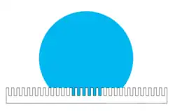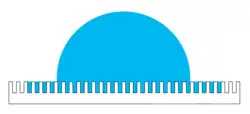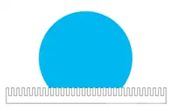 A well-known departure from ideal conditions is when the surface of interest has a rough texture. The rough texture of a surface can fall into one of two categories: homogeneous or heterogeneous. A homogeneous wetting regime is where the liquid fills in the grooves of a rough surface. A heterogeneous wetting regime, though, is where the surface is a composite of two types of patches. An important example of such a composite surface is one composed of patches of both air and solid. Such surfaces have varied effects on the contact angles of wetting liquids. Cassie–Baxter and Wenzel are the two main models that attempt to describe the wetting of textured surfaces. However, these equations only apply when the drop size is sufficiently large compared with the surface roughness scale.[35] When the droplet size is comparable to that of the underlying pillars, the effect of line tension should be considered.[36]