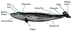Whale morphology shows several examples of convergent evolution, the most obvious being the streamlined fish-like body shape.[25] Other examples include the use of echolocation for hunting in low light conditions — which is the same hearing adaptation used by bats — and, in the rorqual whales, jaw adaptations, similar to those found in pelicans, that enable engulfment feeding.[26]