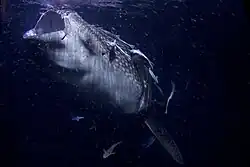 The first attempt at keeping whale sharks in captivity was in 1934 when an individual was kept for about four months in a netted-off natural bay in Izu, Japan.[96] The first attempt of keeping whale sharks in an aquarium was initiated in 1980 by the Okinawa Churaumi Aquarium (then known as Okinawa Ocean Expo Aquarium) in Japan.[93] Since 1980, several have been kept at Okinawa, mostly obtained from incidental catches in coastal nets set by fishers (none after 2009), but two were strandings. Several of these were already weak from the capture/stranding and some were released,[93] but initial captive survival rates were low.[95] After the initial difficulties in maintaining the species had been resolved, some have survived long-term in captivity.[93] The record for a whale shark in captivity is an individual that, as of 2021, has lived for more than 26 years in the Okinawa Churaumi Aquarium from Okinawa Ocean Expo Aquarium.[97][93] Following Okinawa, Osaka Aquarium started keeping whale sharks and most of the basic research on the keeping of the species was made at these two institutions.[98]