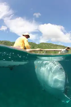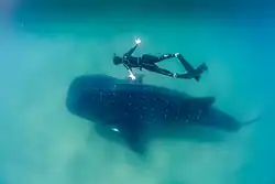 Despite their great size, whale sharks pose no danger to humans. Younger whale sharks are gentle and can play with divers. Underwater photographers such as Fiona Ayerst have photographed them swimming close to humans without any danger.[75] Although whale sharks are docile fish, touching or riding the sharks is strictly forbidden and fineable in most countries,[76][77][78] as it can cause serious harm to the animal.[79][80][81]