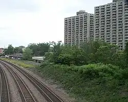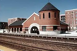 The Union Pacific West Line runs through downtown Wheaton and has been a staple of the city since its founding in the mid-1800s. Metra has two stops along the line in Wheaton, one at College Avenue serving Wheaton College, and another at West Street in the heart of the commercial district. It passes under a bridge just west of downtown, and over County Farm Road, just north of the DuPage County Government Complex.[50]