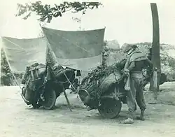 Further annotations of the text by Pei Songzhi (430 AD) described the design in detail as a large single central wheel and axle around which a wooden frame was constructed in representation of an ox.[7] Writing later in the 11th century, the Song dynasty (960–1279) scholar Gao Cheng wrote that the small wheelbarrow of his day, with shafts pointing forward (so that it was pulled), was the direct descendant of Zhuge Liang's wooden ox.[8] Furthermore, he pointed out that the third century 'gliding horse' wheelbarrow featured the simple difference of the shaft pointing backwards (so that it was pushed instead).[8]
