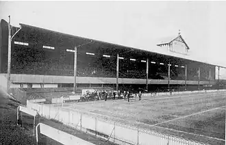By 1904, the ground had an overall capacity of 32,000, with a main stand that provided seating for 500, and covered accommodation for 12,000.[15][16] In February 1904, overcrowding during an FA Cup match against Aston Villa led to the abandonment of the match and a pitch invasion by fans, resulting in the club being fined and ordered to erect a steel fence around the pitch.[18] The ground needed to be expanded; although a large earth bank was built at the Park Lane end in 1904, the club's ability to develop the White Hart Lane site was restricted by the terms of the ground lease with Charringtons. Following a share issue, the club bought the freehold for £8,900 in 1905. An additional £2,600 was used to purchase the land at the northern (Paxton Road) end, where another large bank was built the same year to match the one at the Park Lane end, bringing the capacity up to 40,000.[16][22] Spurs were admitted to the Second Division of the Football League in 1908, and they played their first league game on 1 September 1908 against Wolverhampton Wanderers at White Hart Lane. Spurs won 3–0, and the first Football League goal at the ground was scored by Vivian Woodward.[29]