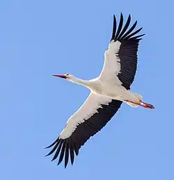 The white stork (Ciconia ciconia) is a large bird in the stork family, Ciconiidae. Its plumage is mainly white, with black on the bird's wings. Adults have long red legs and long pointed red beaks, and measure on average 100–115 cm (39–45 in) from beak tip to end of tail, with a 155–215 cm (61–85 in) wingspan. The two subspecies, which differ slightly in size, breed in Europe north to Finland, northwestern Africa, Palearctic east to southern Kazakhstan and southern Africa. The white stork is a long-distance migrant, wintering in Africa from tropical Sub-Saharan Africa to as far south as South Africa, or on the Indian subcontinent. When migrating between Europe and Africa, it avoids crossing the Mediterranean Sea and detours via the Levant in the east or the Strait of Gibraltar in the west, because the air thermals on which it depends for soaring do not form over water.