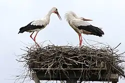 The white stork breeds in open farmland areas with access to marshy wetlands, building a large stick nest in trees, on buildings, or on purpose-built man-made platforms.[81] Each nest is 1–2 m (3.3–6.6 ft) in depth, 0.8–1.5 m (2.6–4.9 ft) in diameter, and 60–250 kg (130–550 lb) in weight.[82] Nests are built in loose colonies.[71] Not persecuted as it is viewed as a good omen, it often nests close to human habitation; in southern Europe, nests can be seen on churches and other buildings. The nest is typically used year after year, especially by older males. The males arrive earlier in the season and choose the nests. Larger nests are associated with greater numbers of young successfully fledged, and appear to be sought after.[83] Nest change is often related to a change in the pairing and failure to raise young the previous year, and younger birds are more likely to change nesting sites.[84] Although a pair may be found to occupy a nest, partners may change several times during the early stages and breeding activities begin only after a stable pairing is achieved.[85]