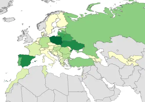 A large population of white storks breeds in central (Poland, Ukraine and Germany) and southern Europe (Spain and Turkey). In a 2004/05 census, there were 52,500 pairs in Poland, 30,000 pairs in Ukraine, 20,000 pairs in Belarus, 13,000 pairs in Lithuania (the highest known density of this species in the world), 10,700 pairs in Latvia, and 10,200 in Russia. There were around 5,500 pairs in Romania, 5,300 in Hungary, and an estimated 4,956 breeding pairs in Bulgaria.[129] In former Yugoslavia there are 1,700 in Croatia, 1,400 in Serbia,[130][131] 236 in Slovenia and an estimated 40 breeding pairs in Bosnia and Herzegovina.[129] In Germany, the majority of the total 4,482 pairs were in the eastern region, especially in the states of Brandenburg and Mecklenburg-Vorpommern (1296 and 863 pairs in 2008 respectively).[132] Apart from Spain and Portugal (33,217 and 7,684 pairs in 2004/05 respectively), populations are generally much less stable. In the eastern Mediterranean region, Turkey has a sizeable population of 6,195 pairs, and Greece 2,139 pairs. In Western Europe, the white stork remains a rare bird despite conservation efforts. In 2004, France had only 973 pairs, and the Netherlands had 528 pairs.[129] In Denmark, the species had consistently bred since the 15th century, peaking at several thousand pairs around 1800. Afterwards, it began declining mainly due to habitat loss (especially conversion of wetlands and meadows into modern farming), with only a few tens of breeding pairs in 1974 and none in 2008.[133][134] Since then, it has reestablished itself and the population has slowly started to increase, reaching ten pairs in 2023.[135] In Armenia, the population of the white stork slightly increased in the period between 2005 and 2015, and by the last data reached 652 pairs.[136][137][138]