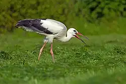 White storks consume a wide variety of animal prey. They prefer to forage in meadows that are within roughly 5 km (3 mi) of their nest and sites where the vegetation is shorter so that their prey is more accessible.[42] Their diet varies according to season, locality and prey availability. Common food items include insects (primarily beetles, grasshoppers, locusts and crickets), earthworms, reptiles, amphibians, particularly frog species such as the edible frog (Pelophylax kl. esculentus) and common frog (Rana temporaria) and small mammals such as voles, moles and shrews. Less commonly, they also eat bird eggs and young birds, fish, molluscs, crustaceans and scorpions. They hunt mainly during the day, swallowing small prey whole, but killing and breaking apart larger prey before swallowing.[70] Rubber bands are mistaken for earthworms and consumed, occasionally resulting in fatal blockage of the digestive tract.[100]
