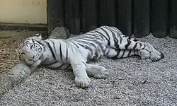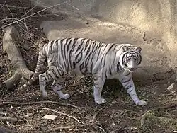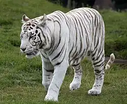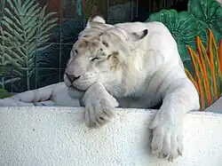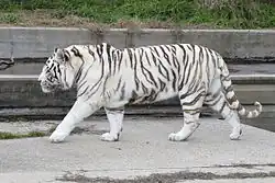 The white tiger is a leucistic morph of the tiger, typically the Bengal tiger. White tigers have the typical black stripes of a tiger, but its coat is otherwise white or near-white, and it has blue eyes. Natural occurrences of this mutation are occasionally reported in the wild in India. The vast majority of white tigers are a result of intentional inbreeding for human entertainment, a practice which is banned by the Association of Zoos and Aquariums for institutions wishing to be accredited.[1][2]