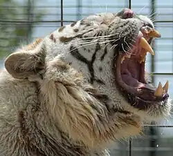 An additional genetic condition can result in near-complete absence of stripes, making the tiger almost pure white. One such specimen was exhibited at Exeter Change in London in 1820, and described by Georges Cuvier as "A white variety of Tiger is sometimes seen, with the stripes very opaque, and not to be observed except in certain angles of light."[19] Naturalist Richard Lydekker said that, "a white tiger, in which the fur was of a creamy tint, with the usual stripes faintly visible in certain parts, was exhibited at the old menagerie at Exeter Change about the year 1820."[20] Hamilton Smith said, "A wholly white tiger, with the stripe-pattern visible only under reflected light, like the pattern of a white tabby cat, was exhibited in the Exeter Change Menagerie in 1820" and John George Wood stated that, "a creamy white, with the ordinary tigerine stripes so faintly marked that they were only visible in certain lights." Edwin Henry Landseer also drew this tigress in 1824.