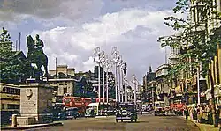The Whitehall Theatre opened in 1930 at the north west end of the street, on a site that had previously been Ye Old Ship Tavern in the 17th century. The revue Whitehall Follies opened in 1942, which drew controversy over its explicit content featuring the stripper and actress Phyllis Dixey. The theatre became known for its series of farces, reviving a tradition on Whitehall that had begun with court jesters at the palace during the 16th century; these included several plays featuring actor-manager Brian Rix throughout the 1950s and '60s, and 1981's satirical Anyone for Denis, written by John Wells and Private Eye editor Richard Ingrams.[34] The venue was Grade II listed in 1996 and renamed the Trafalgar Studios in 2004.[35]