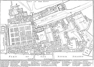 Wallingford House was constructed in 1572 by William Knollys, 1st Earl of Banbury along the western edge of Whitehall.[9] The Duke of Buckingham bought the house in 1622,[10] and it was subsequently used by Charles I. During the reign of William III, it was bought for the Admiralty.[11] The Old Admiralty Buildings now sit on the house's site.[9]