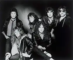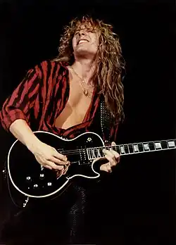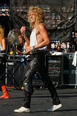 With the help of John Kalodner, Coverdale recruited Adrian Vandenberg and Tommy Aldridge, as well as guitarist Vivian Campbell (formerly of Dio) and bassist Rudy Sarzo (formerly of Quiet Riot) to the band.[72][139][140] This new line-up would appear in all the promotional materials for the forthcoming album.[141] Whitesnake also adopted a new image, akin to glam metal bands of the time, in order to appeal more to American audiences. When asked about the band's makeover, Coverdale stated: "I'm competing with people like Jon Bon Jovi. I've gotta look the part."[142]
