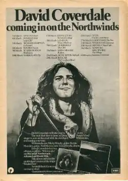 In March 1976, singer David Coverdale left the English hard rock group Deep Purple; he had joined the band three years prior and recorded three successful albums with them. After leaving Deep Purple, Coverdale released his solo album White Snake in February 1977.[nb 1] His second solo album Northwinds was released in March 1978.[8] Both combined elements of blues, soul and funk, as Coverdale had wanted to distance himself from the hard rock sound synonymous with Deep Purple.[9] Both records featured former Snafu guitarist Micky Moody, whom Coverdale had known since the late 1960s.[10] Moody was the first to join Coverdale's backing band, which he began assembling in London.[11][12] As stated by Coverdale, "Whitesnake were actually formed to promote Northwinds on a one-off promotional tour".[13] Moody suggested bringing in a second guitarist, with the spot ultimately going to Bernie Marsden, formerly of UFO and Paice Ashton Lord.[12][14] With his help, the band were able to recruit bassist Neil Murray, who had played with Marsden in Cozy Powell's Hammer.[15] The group's initial line-up was rounded out by drummer Dave "Duck" Dowle and keyboardist Brian Johnston, who had played together in Streetwalkers.[16] Other early candidates for the band were drummers Cozy Powell and Dave Holland as well as guitarist Mel Galley.[17]