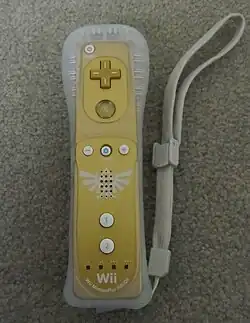 At E3 2011, it was revealed that a gold Wii Remote Plus with the Hylian Crest superimposed over its speaker would be released alongside The Legend of Zelda: Skyward Sword.[68][69] It was available as part of a bundle with Skyward Sword for a limited time.[70] A matching gold Nunchuk was also available to earn for Club Nintendo members for a limited time.[71]