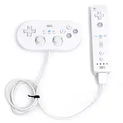 At the 2006 Electronic Entertainment Expo Nintendo introduced the Classic Controller, which plugs into the Wii Remote via a cord in a similar fashion to the Nunchuk.[15] Unlike most accessories, the Classic Controller largely usurps the Remote's functionality, with the Remote's buttons duplicated on the Controller. The Remote is used primarily as a wireless transmitter for the Controller and where applicable retains its pointing-device functionality. It can also still be used as a valid, active controller by another player in multiplayer modes of games like Bust-A-Move Bash! and SpeedZone.