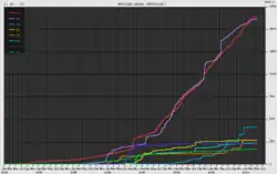 The use of bots to generate large numbers of articles is visible as "growth spurts" in this graph of article counts at the largest eight Wiktionary editions. (Data as of December 2009)