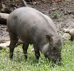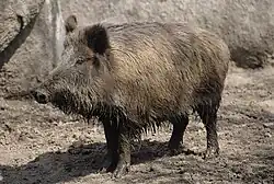 As of 2005, up to 16 subspecies are recognized, which are divided into four regional groupings based on skull height and lacrimal bone length.[2] The species lives in matriarchal societies consisting of interrelated females and their young (both male and female). Fully grown males are usually solitary outside the breeding season.[10] The wolf is the wild boar's main predator in most of its natural range except in the Far East and the Lesser Sunda Islands, where it is replaced by the tiger and Komodo dragon respectively.[11][12] The wild boar has a long history of association with humans, having been the ancestor of most domestic pig breeds and a big-game animal for millennia. Boars have also re-hybridized in recent decades with feral pigs; these boar–pig hybrids have become a serious pest wild animal in the Americas and Australia.