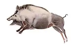 MtDNA studies indicate that the wild boar originated from islands in Southeast Asia such as Indonesia and the Philippines, and subsequently spread onto mainland Eurasia and North Africa.[8] The earliest fossil finds of the species come from both Europe and Asia, and date back to the Early Pleistocene.[19] By the late Villafranchian, S. scrofa largely displaced the related S. strozzii, a large, possibly swamp-adapted suid ancestral to the modern S. verrucosus throughout the Eurasian mainland, restricting it to insular Asia.[9] Its closest wild relative is the bearded pig of Malacca and surrounding islands.[4]