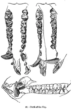 DNA evidence from sub-fossil remains of teeth and jawbones of Neolithic pigs shows that the first domestic pigs in Europe had been brought from the Near East. This stimulated the domestication of local European wild boars, resulting in a third domestication event with the Near Eastern genes dying out in European pig stock. Modern domesticated pigs have involved complex exchanges, with European domesticated lines being exported in turn to the ancient Near East.[49][50] Historical records indicate that Asian pigs were introduced into Europe during the 18th and early 19th centuries.[47] Domestic pigs tend to have much more developed hindquarters than their wild boar ancestors, to the point where 70% of their body weight is concentrated in the posterior, which is the opposite of wild boar, where most of the muscles are concentrated on the head and shoulders.[51]