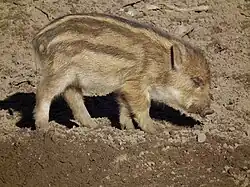 Newborn piglets weigh around 600–1,000 grams, lacking underfur and bearing a single milk incisor and canine on each half of the jaw.[4] There is intense competition between the piglets over the most milk-rich nipples, as the best-fed young grow faster and have stronger constitutions.[65] The piglets do not leave the lair for their first week of life. Should the mother be absent, the piglets lie closely pressed to each other. By two weeks of age, the piglets begin accompanying their mother on her journeys. Should danger be detected, the piglets take cover or stand immobile, relying on their camouflage to keep them hidden. The neonatal coat fades after three months, with adult colouration being attained at eight months. Although the lactation period lasts 2.5–3.5 months, the piglets begin displaying adult feeding behaviours at the age of 2–3 weeks. The permanent dentition is fully formed by 1–2 years. With the exception of the canines in males, the teeth stop growing during the middle of the fourth year. The canines in old males continue to grow throughout their lives, curving strongly as they age. Sows attain sexual maturity at the age of one year, with males attaining it a year later. However, estrus usually first occurs after two years in sows, while males begin participating in the rut after 4–5 years, as they are not permitted to mate by the older males.[4] The maximum lifespan in the wild is 10–14 years, though few specimens survive past 4–5 years.[66] Boars in captivity have lived for 20 years.[11]