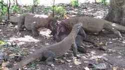 Banded pig (S. s. vittatus) being eaten by Komodo dragons