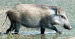 Boars may occasionally prey on small vertebrates like newborn deer fawns, leporids and galliform chicks, as well as small calves, lambs and other livestock.[56] Boars inhabiting the Volga Delta and near some lakes and rivers of Kazakhstan have been recorded to feed extensively on fish like carp and Caspian roach. Boars in the former area also feed on cormorant and heron chicks, bivalved molluscs, trapped muskrats and mice.[4] There is at least one record of a wild boar killing and eating a bonnet macaque in southern India's Bandipur National Park, though this may have been a case of intraguild predation, brought on by interspecific competition for human handouts.[73] There is also at least one recorded case of a group of wild boar attacking, killing, and eating an adult, healthy female axis deer (Axis axis) as a pack.[74]