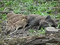 The breeding period in most areas lasts from November to January, though most mating only lasts a month and a half. Prior to mating, the males develop their subcutaneous armour in preparation for confronting rivals. The testicles double in size and the glands secrete a foamy yellowish liquid. Once ready to reproduce, males travel long distances in search of a sounder of sows, eating little on the way. Once a sounder has been located, the male drives off all young animals and persistently chases the sows. At this point, the male fiercely fights potential rivals.[4] A single male can mate with 5–10 sows.[11] By the end of the rut, males are often badly mauled and have lost 20% of their body weight,[4] with bite-induced injuries to the penis being common.[63] The gestation period varies according to the age of the expecting mother. For first-time breeders, it lasts 114–130 days, while it lasts 133–140 days in older sows. Farrowing occurs between March and May, with litter sizes depending on the age and nutrition of the mother. The average litter consists of 4–6 piglets, with the maximum being 10–12.[4][b] The piglets are whelped in a nest constructed from twigs, grasses and leaves. Should the mother die prematurely, the piglets are adopted by the other sows in the sounder.[65]