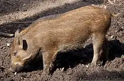 The wild boar (Sus scrofa), also known as the wild swine,[4] common wild pig,[5] Eurasian wild pig,[6] or simply wild pig,[7] is a suid native to much of Eurasia and North Africa, and has been introduced to the Americas and Oceania. The species is now one of the widest-ranging mammals in the world, as well as the most widespread suiform.[5] It has been assessed as least concern on the IUCN Red List due to its wide range, high numbers, and adaptability to a diversity of habitats.[1] It has become an invasive species in part of its introduced range. Wild boars probably originated in Southeast Asia during the Early Pleistocene[8] and outcompeted other suid species as they spread throughout the Old World.[9]