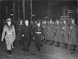 The reaction of the British government to Hitler's demands on the Sudetenland was more cautious. At a meeting with Hitler in Munich, British Prime Minister Neville Chamberlain and French Prime Minister Édouard Daladier chose diplomacy over war.[60] The Munich Agreement was thus a severe disappointment for Kleist and Canaris.[61] It gave Hitler's reputation an important boost and his popularity soared, as he appeared to have brought peace. However, Hitler was scornful of his generals for resisting his plans since he had wanted war. Hermann Göring fell out of favour with him for negotiating peace, but Hitler's drive for war remained unabated although the Western powers had granted him concessions.[62] Canaris was relieved that war was averted and sought to re-establish contact with Hitler since many of the Abwehr reports submitted on the Sudeten crisis had proven to be grossly inaccurate. To Hans Oster and his circle, Canaris suddenly appeared recommitted to Hitler.[63]