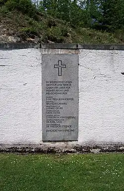 In the final weeks of the war, the Gestapo had moved Admiral Canaris and several other cohorts from Berlin to the Flossenbürg concentration camp in northeast Bavaria, with American troops less than 100 miles away. Investigations dragged on inconclusively until April 1945, when orders were received to dispose of the various remaining prisoners of the plot. Canaris's personal diary was discovered in the Wehrmacht headquarters south of Berlin and presented to Hitler in early April 1945, which implicated him in the conspiracy.[109] Canaris was placed on trial by an SS summary court, presided over by Otto Thorbeck with Walter Huppenkothen as prosecutor.[110] He was charged with treason, convicted, and sentenced to death.[111] Together with his deputy general, Hans Oster, the military jurist General Karl Sack, the theologian Dietrich Bonhoeffer, and military officer Ludwig Gehre, Canaris was led to the gallows naked and executed on 9 April, just weeks before the end of the European war.[29]