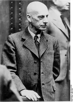 Leeb was tried by the United States military tribunal in Nuremberg in the High Command Trial. Leeb's defence attorney Hans Laternser acted as the de facto lead defence counsel and often represented other parties in matters of procedure. He defended the "decency" of the German officer corps and asserted that it had displayed respect for the laws of war.[24] The defence attributed the actions of the German military against civilians, hostages and partisans to battle conditions and military necessity. Addressing the criminal orders that Leeb and other defendants had passed on, Laternser claimed that Leeb was a humane soldier who had neither seen nor transmitted such orders and had no opportunity to countermand them. He claimed that Leeb knew nothing of the activities of the Einsatzgruppen in his area of command and anyway had no jurisdiction to stop them.[25]