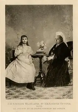King William III died on 23 November 1890 and 10-year-old Wilhelmina became Queen of the Netherlands, though her mother was named regent. In 1895, Wilhelmina visited Queen Victoria of the United Kingdom, who penned an evaluation in her diary: "The young Queen ... still has her hair hanging loose. She is very slight & graceful, has fine features, & seems to be very intelligent & a charming child. She speaks English extremely well & has very pretty manners."[4]