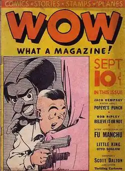 In 1936, high-school friend and fellow cartoonist Bob Kane, of future Batman fame, suggested that the 19-year-old Eisner try selling cartoons to the new comic book Wow, What A Magazine! "Comic books" at the time were tabloid-sized collections of comic strip reprints in color. By 1935, they had begun to include occasional new comic strip-like material. Wow editor Jerry Iger bought an Eisner adventure strip called Captain Scott Dalton, an H. Rider Haggard-styled hero who traveled the world after rare artifacts. Eisner subsequently wrote and drew the pirate strip "The Flame" and the secret agent strip "Harry Karry" for Wow as well.