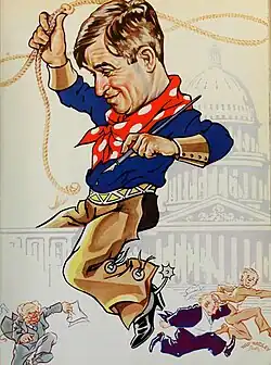 Rogers thought all campaigning was "bunk." To prove the point, he mounted a mock campaign in 1928 for the presidency. His only vehicle was Life, which was then a weekly humor magazine. The campaign was in large part an effort to boost circulation for the struggling periodical.[52] Rogers ran as the "bunkless candidate" of the Anti-Bunk Party. His campaign promise was that, if elected, he would resign. Every week, from Memorial Day through Election Day, Rogers caricatured campaign politics. On Election Day he declared victory and resigned (he did not actually receive any state electoral votes).