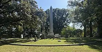Clark and six of his family members were later buried at Bellefontaine Cemetery on October 23, 1860. The monument that marks their graves, a 35-foot (11 m) gray granite obelisk, was dedicated in 1904 on the centennial anniversary of the Louisiana Purchase. Clark's son, Jefferson Kearney Clark, designed the monument and paid $25,000 for it ($425,000 in 2005 figures). Jefferson Clark's wife had to complete the building of the monument after Jefferson died in 1900. Many years later, the monument was restored and rededicated on May 21, 2004, to mark the bicentennial of the Corps of Discovery's departure from St. Charles, Missouri. Members of the Shoshone, Osage, and Mandan tribes spoke at the ceremony, marking Clark's service to these Indian nations during the final years of his life.[33]