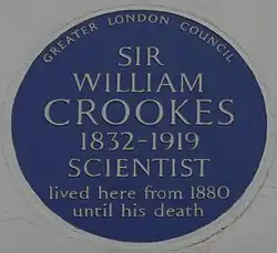 - ^ a b c d e Dyer, B.; Thorpe, T. E.; Harker, J. A.; Simmonds, C.; Perkin, F. Mollwo (1920). "Obituary notices: Sir William Crookes, O.M., 1832–1919". J. Chem. Soc., Trans. 117: 444–472. doi:10.1039/CT9201700444.