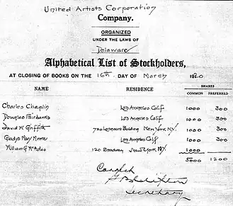 In March 1919, after leaving the Wilson cabinet, McAdoo co-founded the law firm McAdoo, Cotton & Franklin, now known as white shoe firm Cahill Gordon & Reindel. His law firm served as general counsel for the founders of United Artists, with McAdoo taking a 20 percent stake in the common shares of the joint venture, while founders Mary Pickford, Charlie Chaplin, Douglas Fairbanks and D. W. Griffith each held a 25 percent stake in the preferred shares and a 20 percent stake of the common shares. He left the firm in 1922 and moved to California to concentrate on his political career.